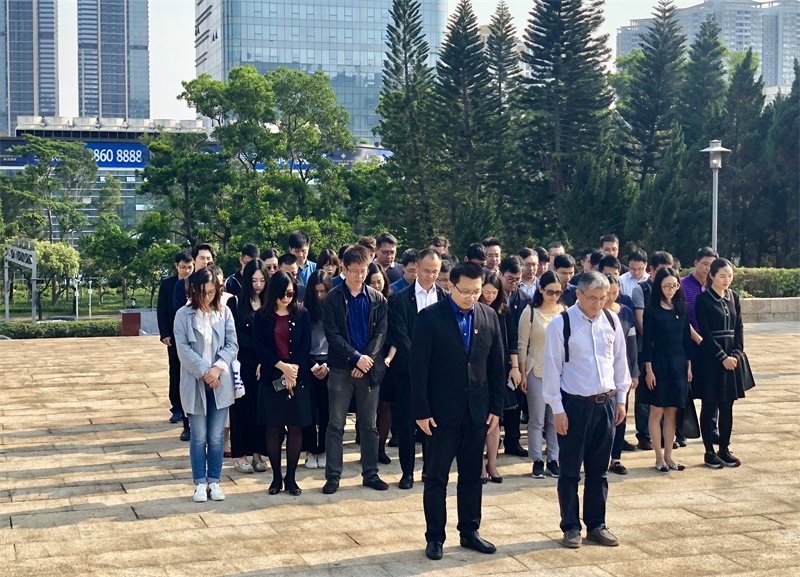 共建队伍一行在下午三点半抵达了陵园。踏上数十级台阶行至革命烈士纪念碑下,全员快速整齐队伍,开启了庄重的祭扫仪式。伴随着萦绕的哀歌,仪式在两位党支部书记带队敬献鲜花、向纪念碑默哀鞠躬、瞻仰碑体等流程中有条不紊进行。迎着烈日,浩浩汤汤50余人始终保持着静立身姿,即使是上前献花和列队绕碑,众人也依旧安静行事;许是青石红墙的厚重肃穆生出的凉意,又或是心底的红色精神在渐渐苏醒。“深圳,是一片英烈辈出的土地,是一座敬重、爱戴英雄的城市。”能源公司党支部书记傅建平说道,“雪沃中原肥劲草,寒凝大地发春华。现世的安稳是无数革命烈士视死如归换来的,传承革命精神、勿忘先烈历史,这才是新时代的作为和担当!”置业党支部书记曾华华也不住感慨: “‘革命烈士永垂不朽’,这份前赴后继、无私无畏的精神将永远激励着深圳发展,激励着前海建设、激励着我们每一个人奋进。”
