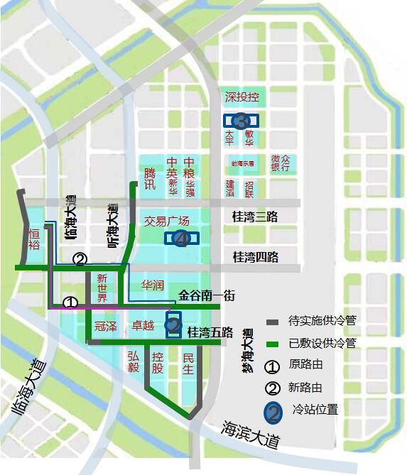 二单元区域集中供冷管网工程,主要沿市政道路、绿化带敷设。供冷管网从二单元冷站南北两侧共分四组供回水管道接出,其中1号外管网向东接至5单元地铁车辆段上盖物业,2号外管网向北接至1单元恒裕及前海国际金融交流中心,3号、4号外管网向南接至二单元五街坊,管网总长度为9.3Km,项目总投资为1.19亿元。本次成功调试的2号外管网,总长度为2.5Km,管网沿金谷南一街、听海大道、桂湾四路、临海大道敷设,主干管管径为DN600~DN900,管网承压1.6Mpa。