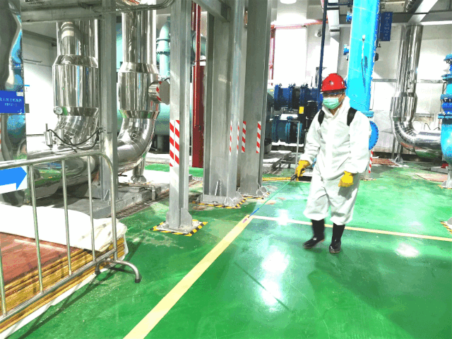 在党员先锋队和青年战疫突击队的凝聚引领下,运营团队成员充分发扬担当精神,勠力同心形成团队合力。为保障客户24小时用冷,冷站运营团队按“四班三倒”组织生产运行,除了常规的设备操作巡查外,还将疫情防控工作细化到每个班次的必做事项中。每日对生产区域进行防疫消杀,每班次对办公区域、设备、工器具、电梯和生产车辆进行杀菌消毒。在加强团队自身防疫安全措施和健康监测的基础上,大幅提高机房巡检和空调系统杀菌消毒频次,加大送排风量,确保空气质量,将病毒传播风险降至最低。