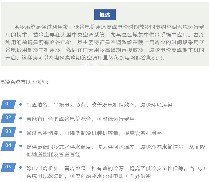 在常规民用建筑中,空调系统用电量占建筑总用电比例大致为30%-60%,而在整个空调系统用电中,主机占比达50%以上。常规空调设计方面,冷水主机容量按照尖峰负荷来配置,在运行过程中,冷水主机根据实际负荷情况开启和调整冷量输出,这使得电力系统、主机设备及配套在绝大部分情况下均处于低负载状态,设备利用率低,空置率高。据统计,空调使用高峰时用电量达到城市用电负荷的30%以上,空调使用量低谷时用电量只有10%左右,这样加大了电网的峰谷用电差。蓄冷空调系统的移峰填谷的功能对电网有很大的平顺作用,蓄冷技术也正得到各方重视和推广。