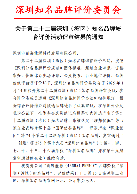 近日,经深圳知名品牌评价委员会公布第二十二届深圳(湾区)知名品牌审核及评价结果,火狐登录入口(以下简称“前海能源”)以“前海能源QIANHAI ENERGY”为品牌名称,凭借出色的市场表现、卓越的品牌形象以及深厚的企业经营实力成功跻身荣誉行列,被评选为新一届“深圳(湾区)知名品牌”企业。